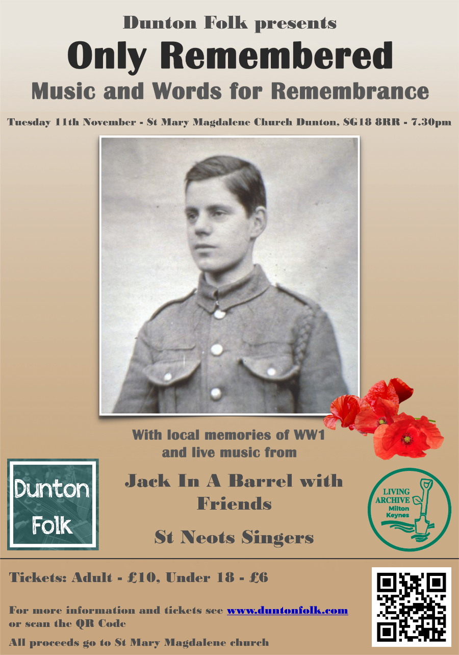 Dunton Folk in association with Turvey Folk are proud to present "Only Remembered: Words and Music for Remembrance", to be performed in St Mary Magdalene Church, Church Street, Dunton, SG18 8RR.